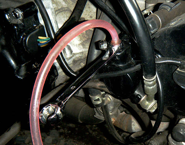 左手はクラッチレバー、右手はフレアナットレンチを握る。