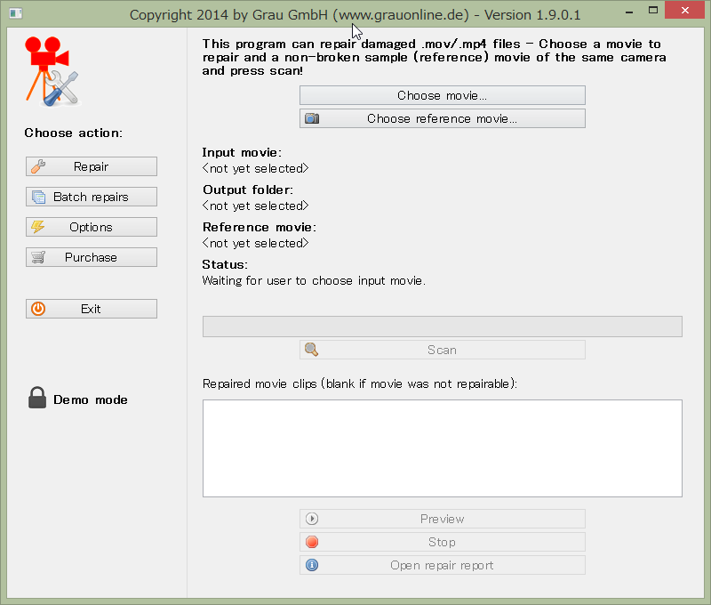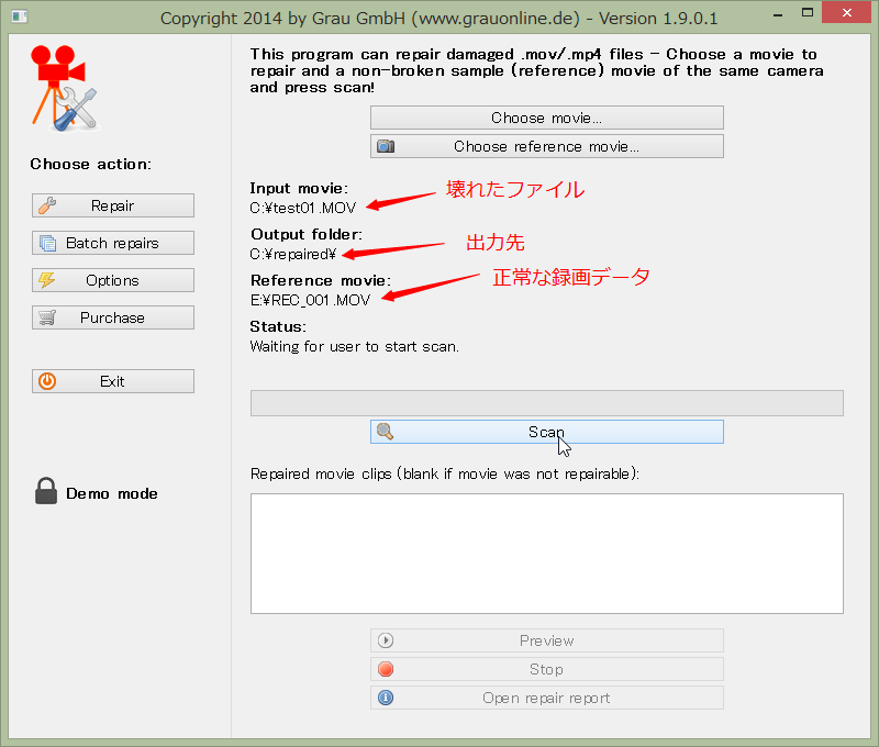 10.次に、Choose reference movieボタンを押して、同じ機種で撮影した正常な動画ファイルを選択します。