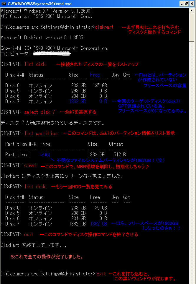 ■ Windows XPでGPT保護パーティションを削除するには、diskpartのcleanコマンドを利用する。