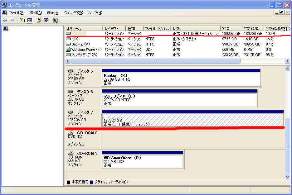 Windows XPでは操作はサポートされていないが、このように「GPT保護パーティション」と表示はされる。