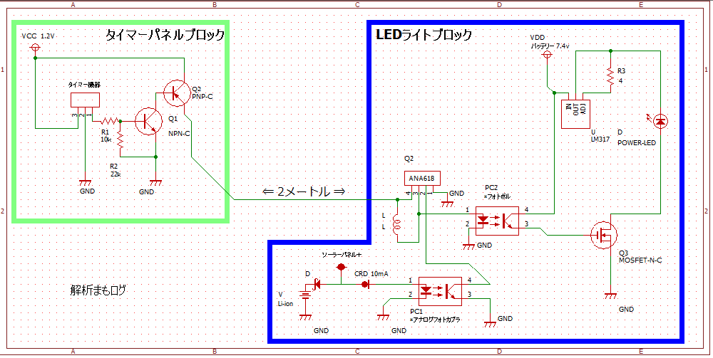 この回路は、ソーラーパネルからバッテリーを充電し、電圧が低くなるとLED照明を点灯させるという回路が乗っています。