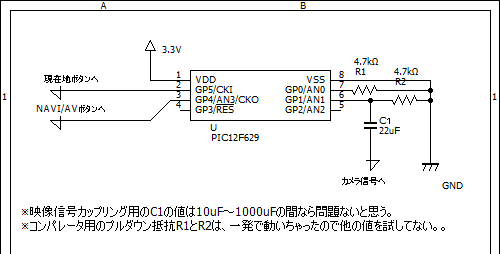 ですので、今回はPICマイコンでこの微弱電圧(カメラON)を検出し、「NAVI/AV」ボタンを長押しエミュレートします。