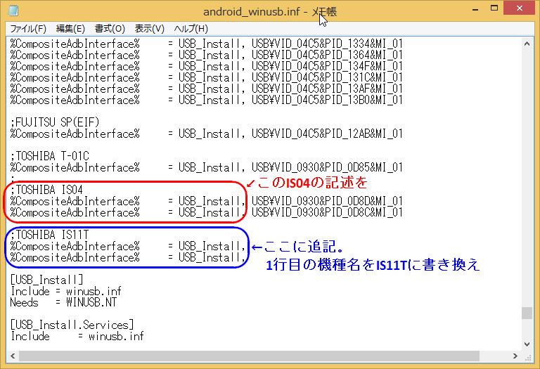 『usb_driver_Fujitsu』フォルダのいくつかのファイル中に『android_winusb.inf』というファイルがあるはずなので、これをテキストエディタ(メモ帳など)で開いてください。