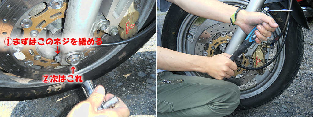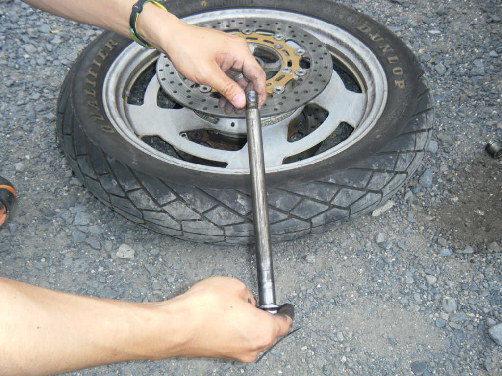 アクスルシャフトが緩んだら、反対側からドライバーなどでアクスルシャフトを叩きます。